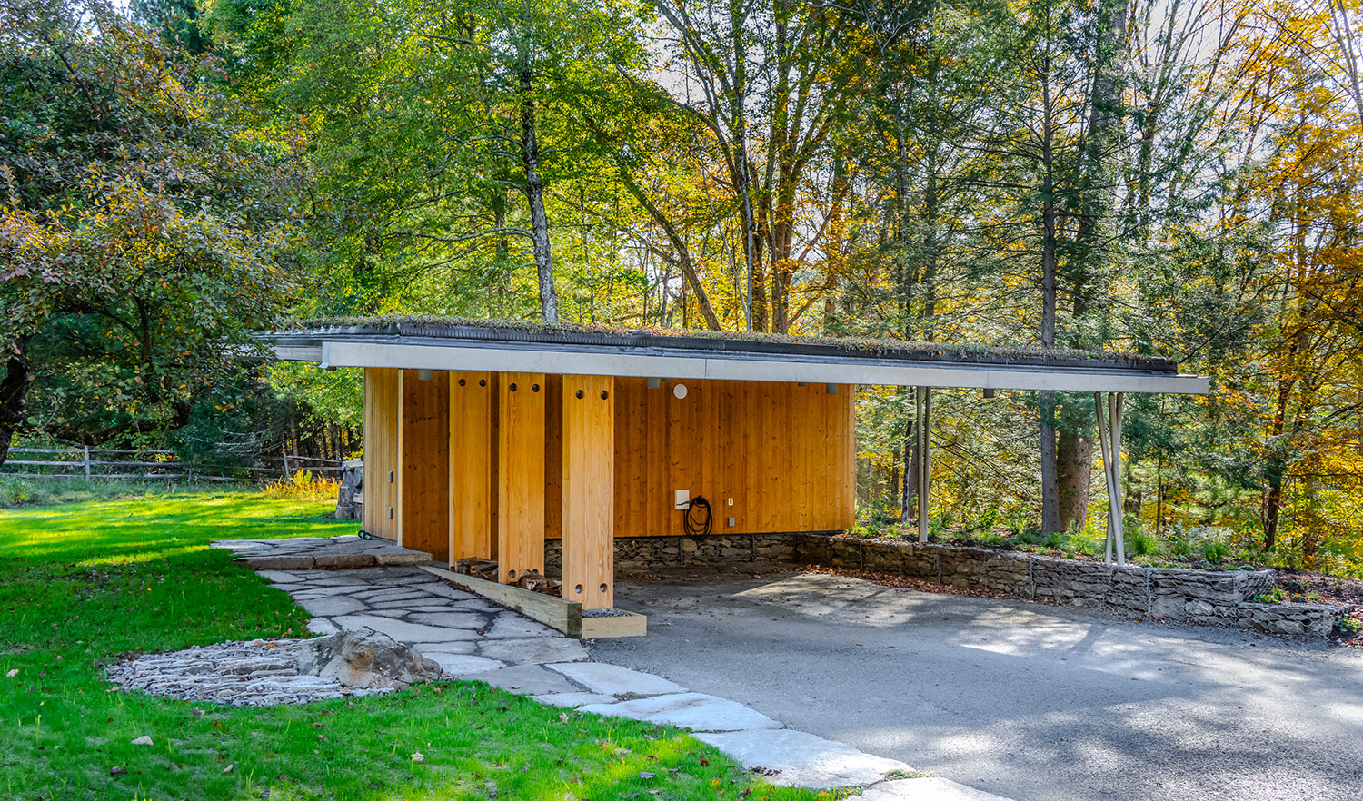 Structurally, the building uses cross-laminated timber, or CLT, panels. CLT is a mass timber product made by layering solid wood panels perpendicular to one another, creating a strong, dimensionally stable structural element. This allowed for a 23 foot clear span roof without introducing steel or additional concrete. The roof itself is constructed from 32 foot by 8 foot panels, approximately 6 7/8 inches thick, creating a continuous structural surface. A green roof was added for both visual and environmental benefits, planted with a variety of sedums that soften the building’s presence and connect it further to the site. A simple walkway links the carport to the house, reinforcing the idea that this structure is part of the landscape rather than an object placed on it.
